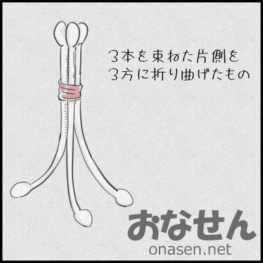 3本を束ねた片方を3方に折り曲げた綿棒を挿入します。1本はGスポットに当たるようにして、残りの2本が膣壁をこするようにゆっくり出し入れします。挿入に3本しか使わないのは、綿棒は圧迫感よりもピンポイントな刺激を楽しむのに適しているからです。